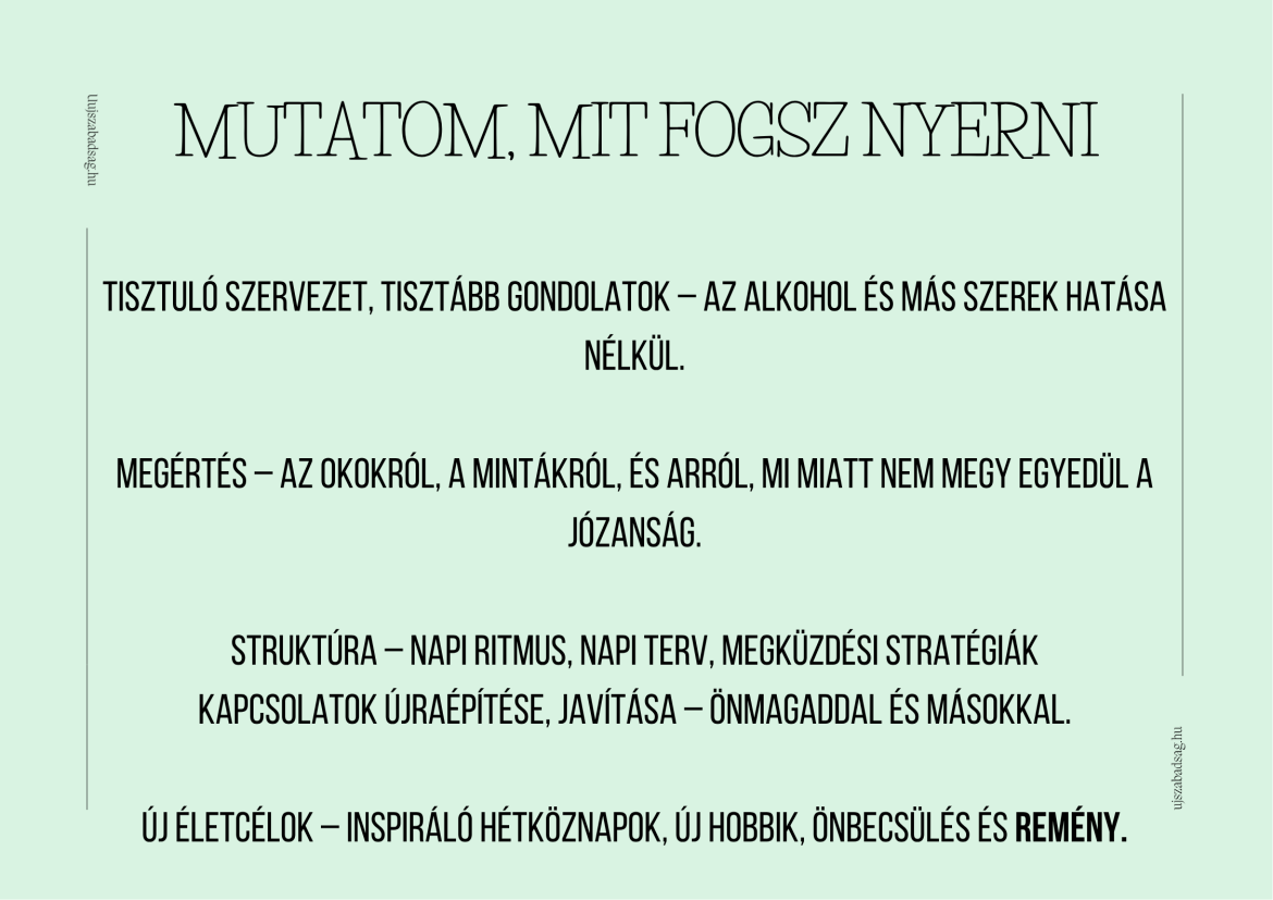 Mert nálunk nem csak azt tanulod meg, hogyan ne igyál vagy használj drogokat, hanem hogyan élj tartósan (élethosszig) józanul – és boldogan!